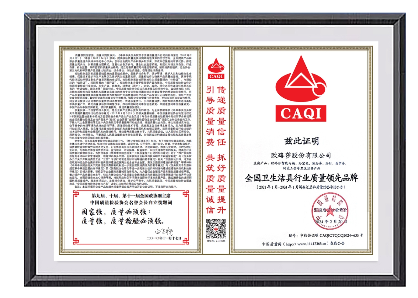 中國質量檢驗協會作為國家市場監督管理總局直屬的全國產品質量監督檢驗領域唯一國家級質量專業機構,已連續20余年開展“產品和服務質量誠信承諾”主題活動,此次榮譽的獲得是國家質量部門對歐路莎品牌形象、產品品質、服務口碑的高度認可。
