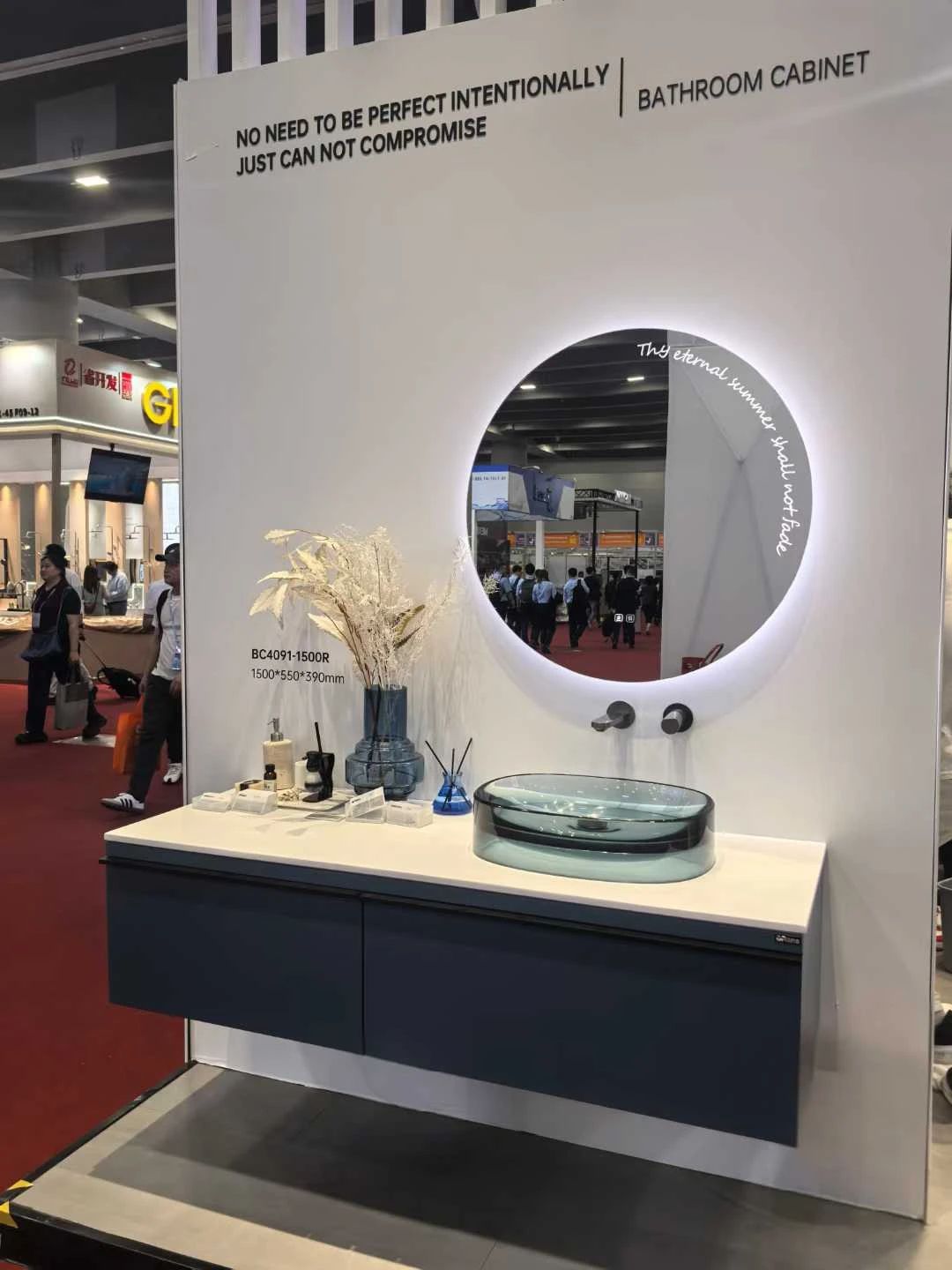 與透明浴缸相呼應(yīng)的BC-4091浴室柜也是展館內(nèi)的一道亮麗風(fēng)景線(xiàn)。藍(lán)色柜體沉穩(wěn)而優(yōu)雅,透明亞克力臺(tái)盆晶瑩而細(xì)膩,二者相得益彰,共同演繹著衛(wèi)浴的時(shí)尚美學(xué)。