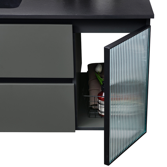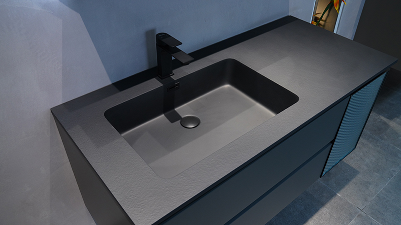 微晶石一體成型的黑色臺盆,臺面黑色火燒石紋理,盆芯亮光,持久耐用。