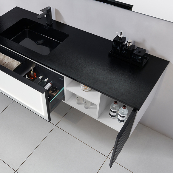 置物格內可放置隨手使用的物品,方便取放;抽屜與側柜分區放置囤購的衛浴產品,密閉環境內保存,不僅干凈衛生,還使衛浴空間更加整潔。